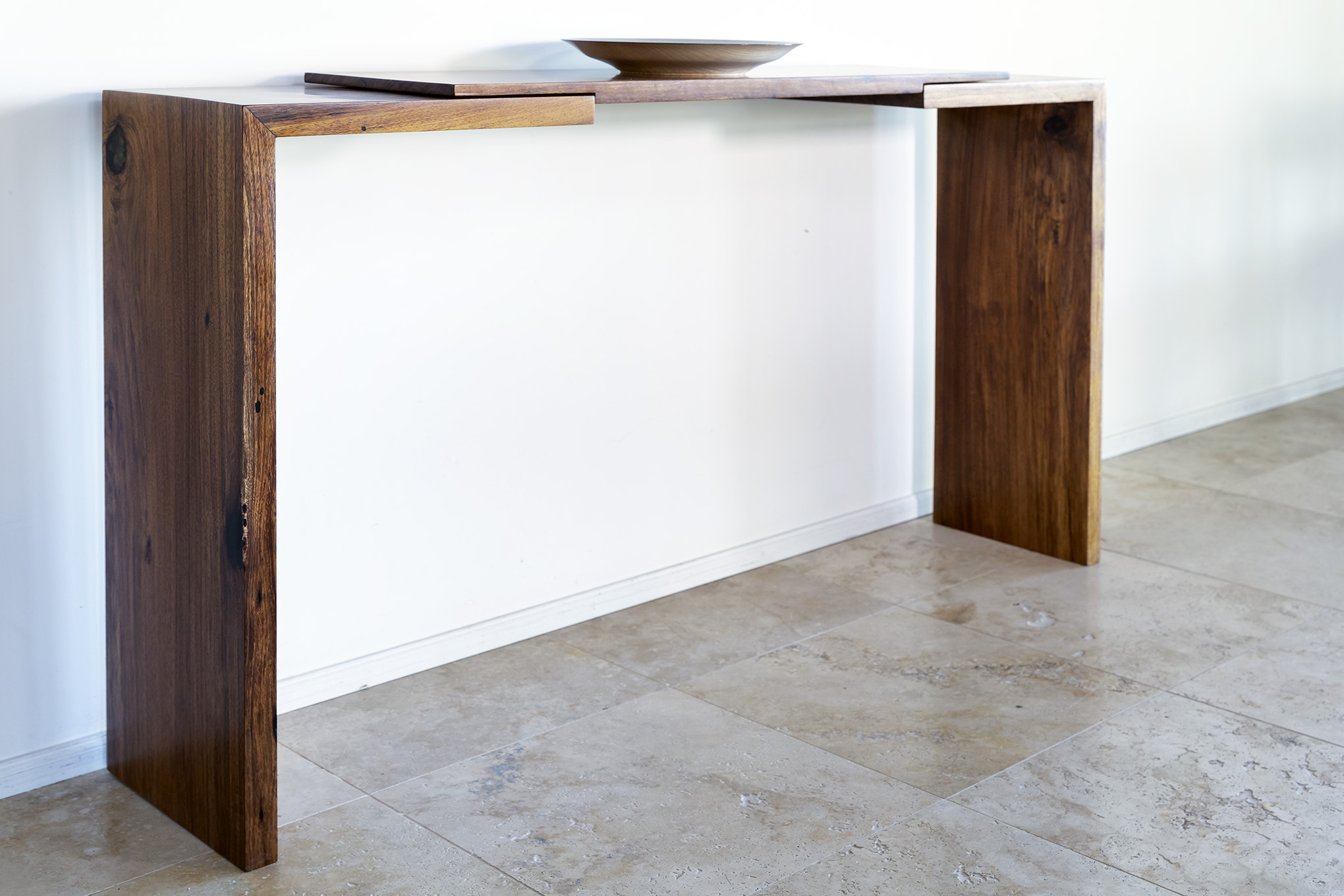 Twin abutments rebated into the underside of the top align with corresponding trenches of the end pieces in an attempt to marry functionality and minimalism.